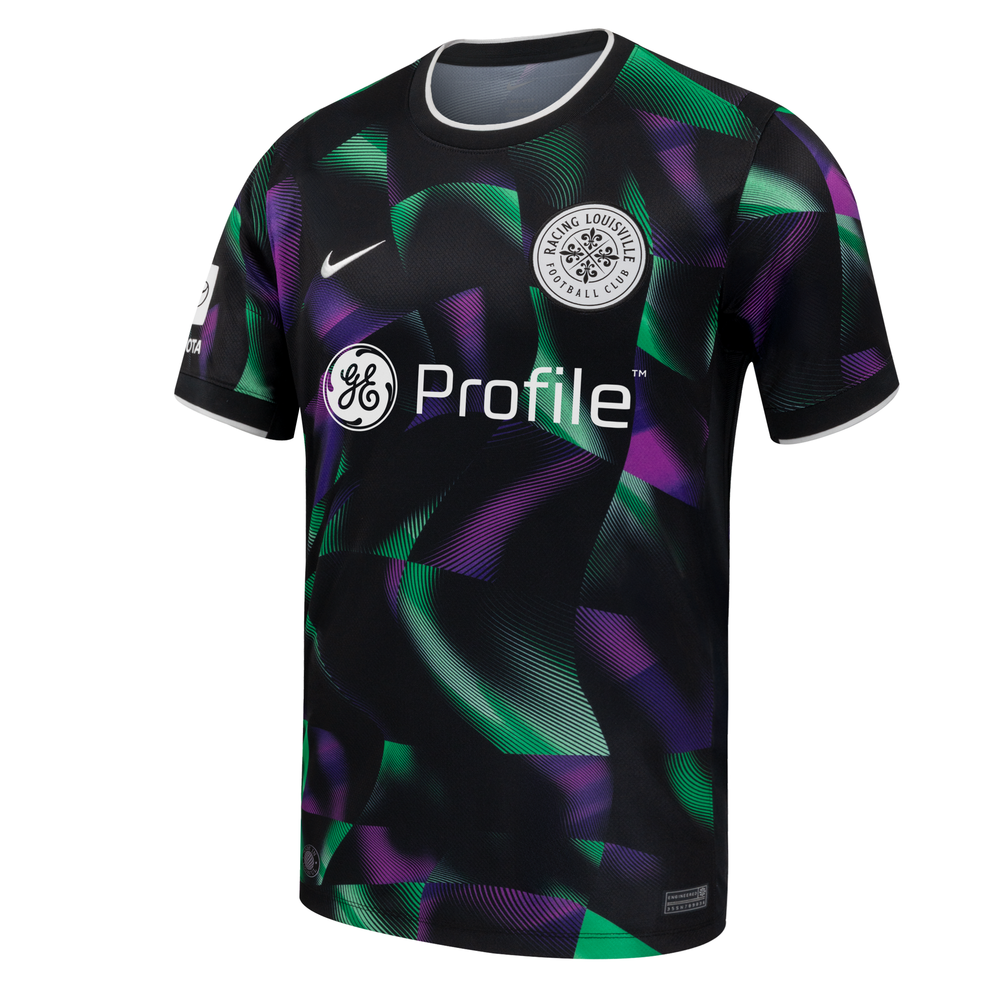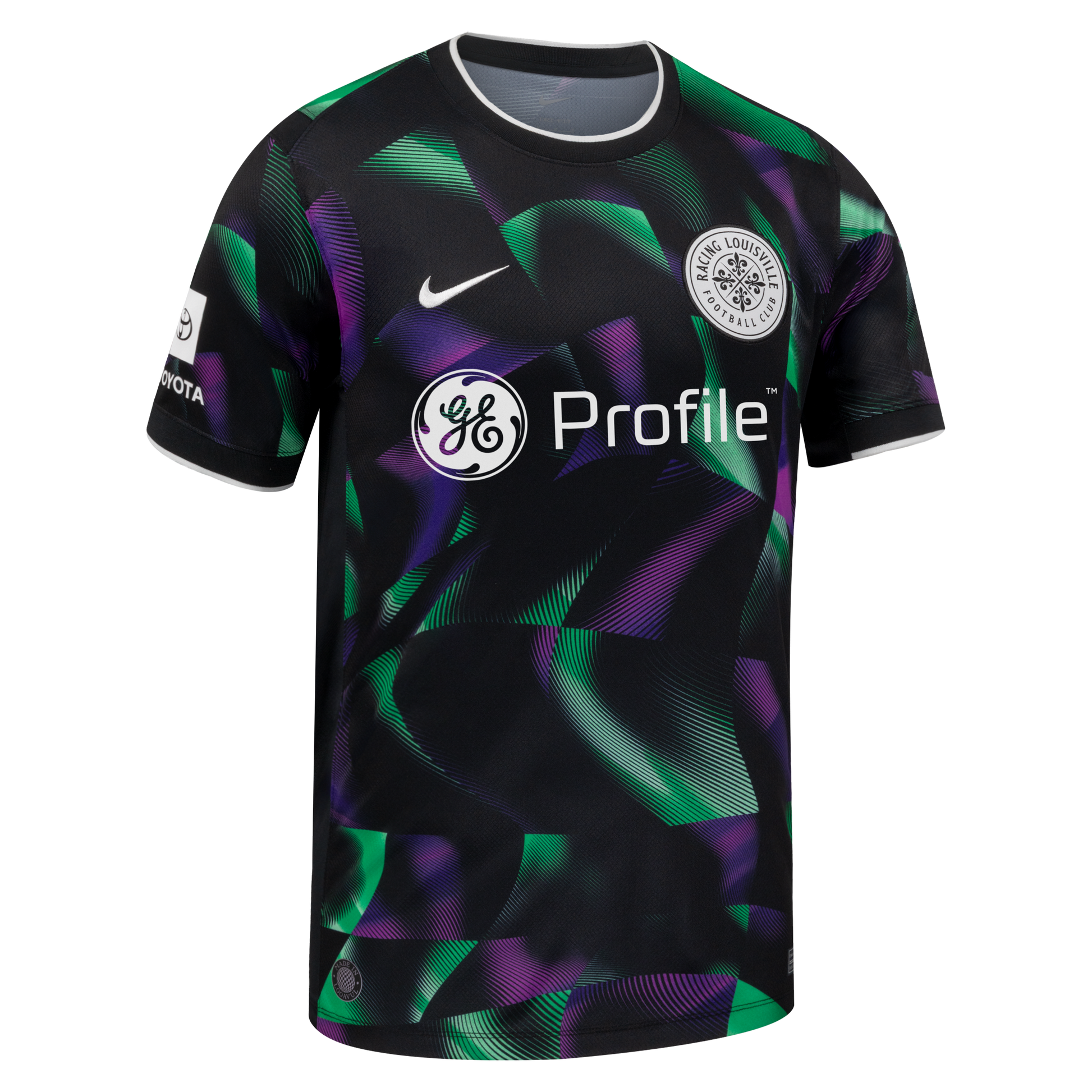 The kit's design is inspired by this history. It features a black field, with lavender, mint and green fragments, which replicate the reflective pattern of the mirror-covered ball. The Racing crest is featured in white, with white trim on the sleeves and neckline. The uniform includes black shorts and socks, with white numerals and trim.